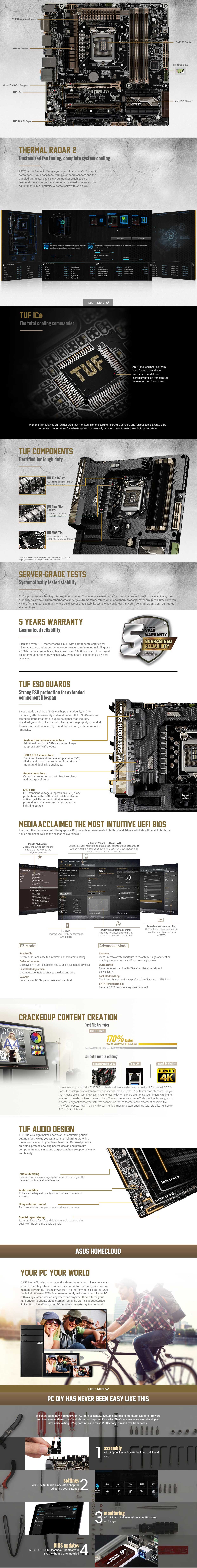 | Special Features | TUF Features: TUF ENGINE! Power Design : - 8 +2 Digital Phase Power Design - TUF Components (New Alloy Choke, Ti-Cap. & MOSFET; certified by military-standard) - ASUS DIGI+ Power Control Utility Ultimate COOL! Thermal Solution : - TUF Thermal Radar 2 - TUF ICe Safe & Stable! Guardian Angel : - TUF ESD Guards ASUS Exclusive Features : - MemOK! - AI Suite 3 - Ai Charger - USB Charger+ - Anti-Surge - ASUS UEFI BIOS EZ Mode featuring friendly graphics user interface - USB 3.0 Boost - Disk Unlocker - Turbo LAN Interactive HomeCloud - Media Streamer ASUS EZ DIY : - ASUS CrashFree BIOS 3 - ASUS EZ Flash 2 - ASUS UEFI BIOS EZ Mode - Multi-language BIOS - Push Notice ASUS Q-Design : - ASUS Q-Shield - ASUS Q-LED (CPU, DRAM, VGA, Boot Device LED) - ASUS Q-Slot - ASUS Q-DIMM - ASUS Q-Connector |