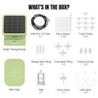About this item Wireless Intelligent Control: With a 2.4GHz Wi-Fi connection and APP-controlled ability, you can remotely manage and view your plantâs watering plan anytime, anywhere. Get real-time notifications such as water shortages through the APP. A smart helper for plant lovers while on vacation.Easy to Setup: Elevate your plant care with our Smart App (Name: HomeGar)! The watering plan can be as detailed as the start time, duration (10s-60min), frequency (1-7 days), and plan bypass (1-3 days). The calendar provides a visual overview of all watering schedules for easy management.Flexible Smart Watering: No taps or sockets required, suitable for indoors or outdoors. Scientific and intelligent watering saves 70% of water than the manual way. You can enable the app notification to receive water shortage reminders to prevent the water pump from drying out.Long-lasting Power: Our watering kit has two power sources: a 2600mAh lithium battery and a solar panel. The solar panel charges the battery, providing 90+ days of uninterrupted operation with full sunlight access. The adjustable panel angle maximizes solar absorption.Easy Installation: The Raddy WS-2 complete kit makes installation a breeze. Package of kits meets the watering of 10 plants, which are WS-2 Auto Irrigation System, 1/4" Tubing (32.8Ft), Filter x 1, Tubing End Caps x 3, Micro Drip Emitters x 10, Straight Barb Fitting x 3, T Barb Fitting x 10, Cross Barb Fitting x 3, Check Valve x 1, USB x 1, Manual x 1.